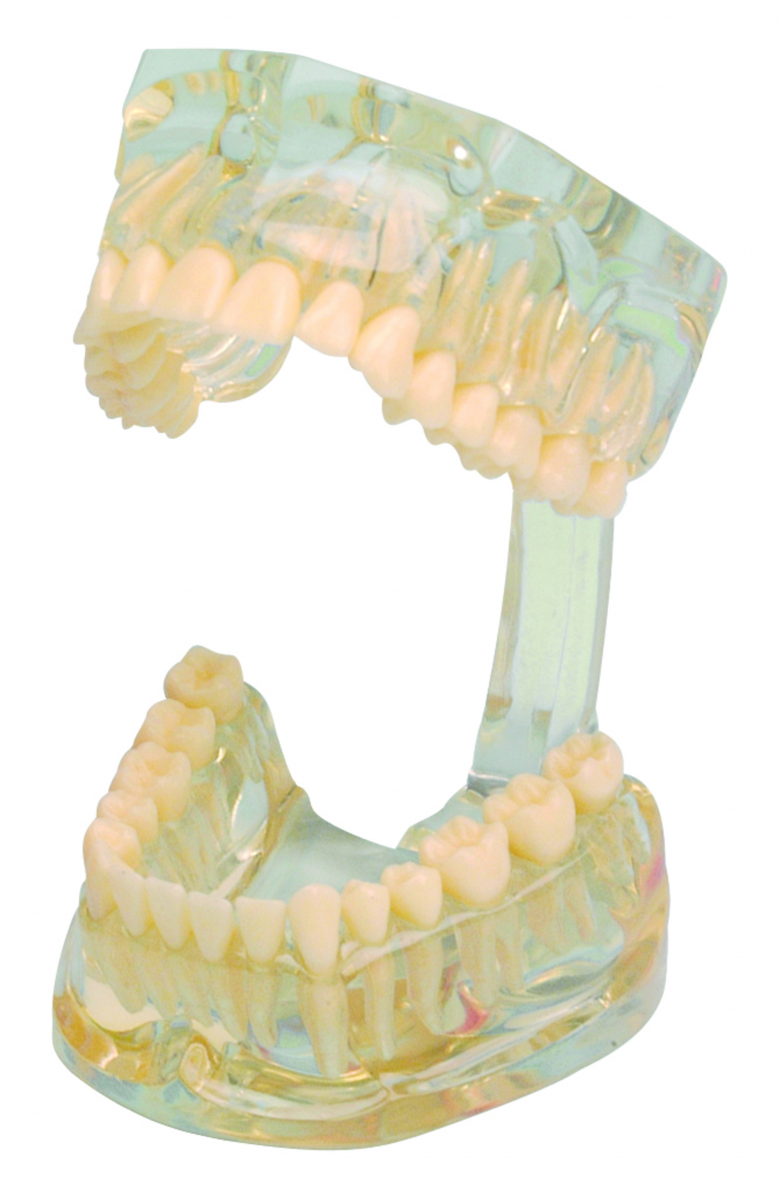 MODELLO DIMOSTRATIVO TRASPARENTE Modello in resina trasparente, con arcate inferiore e superiore in articolatore clip clap. Le radici sono chiaramente visibili e tutti i denti sono amovibili. Confezione: 1 pezzo