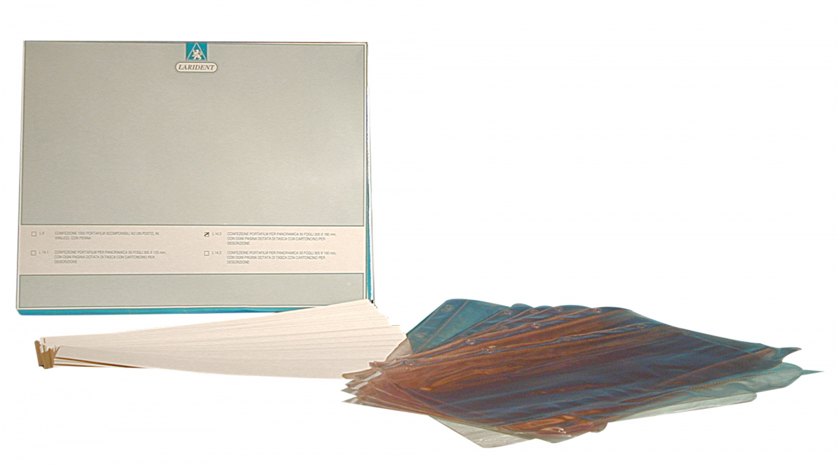 PORTALASTRE PANORAMICO Portaradiografie per panoramica (30,5 x 16,0 cm). Dotato di fogli, provvisti di tasca con cartoncino per descrizione e con fori laterali per raccoglitore. Confezione da 50 pezzi