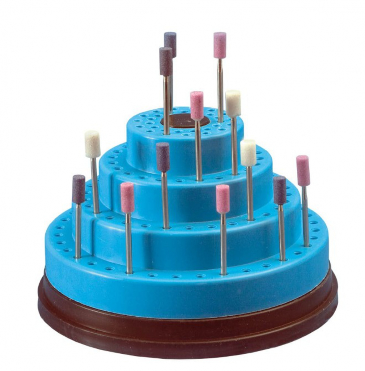 Portafrese girevole “a torre” con 4 livelli (“4 ripiani”). 120 fori per frese RA / HP (rotoburs). Altezza: 7,8 cm • Diametro massimo: 12,9 cm • Diametro minimo superiore: 5 cm. Plastica (polipropilene). Base antiscivolo; struttura compatta e rotabile. Organizzazione e conservazione di frese odontoiatriche in studio o laboratorio, con accesso rapido grazie alla rotazione del supporto.