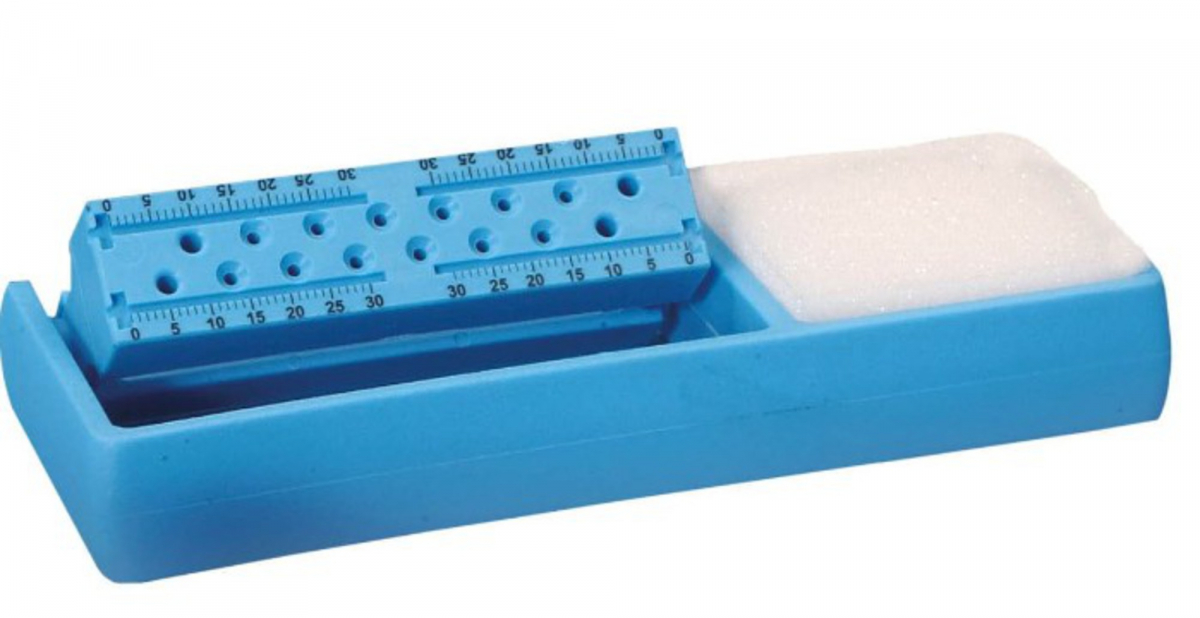 Endo Organizer (contenitore per strumenti endodontici). Capacità di 16 strumenti. Include misuratore canalare integrato e spugnetta per la pulizia degli strumenti. Realizzato in poliammide (o materiale plastico sterylizzabile).