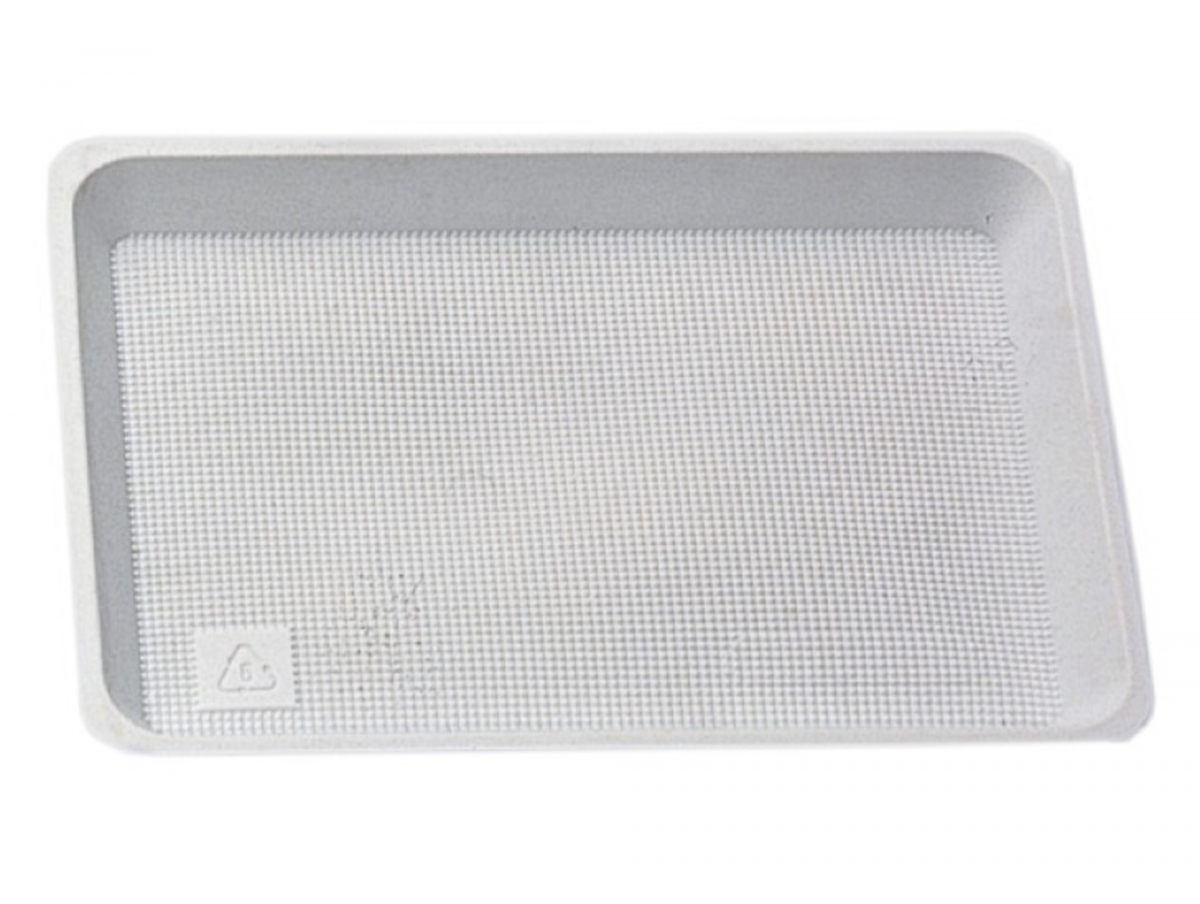 plastica rigida (polistirolo) con fondo zigrinato e bordino rinforzato per dare robustezza. bianco o traslucido; superficie zigrinata (micro-righe) per migliorare la presa degli strumenti e evitare scivolamenti.