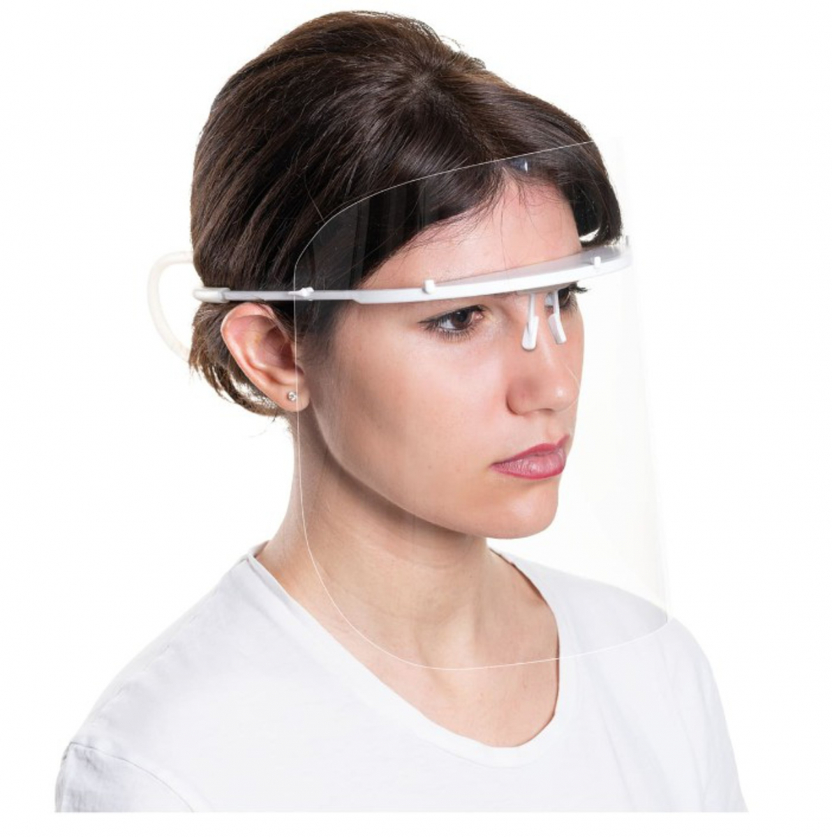 Visiera protettiva in policarbonato trasparente, con spessore di 0,175 mm. Schermo 33 × 23 cm. Montatura ad incastro, ultra leggera, con laccio elastico regolabile in gomma per fissaggio sicuro alla testa. La montatura ha un supporto nasale intercambiabile o rimuovibile a incastro per conforto o uso con occhiali da vista. la montatura è autoclaviabile (circa 121 °C).