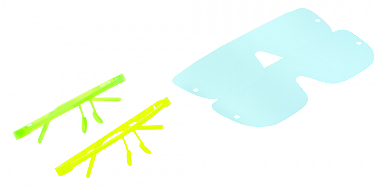 Occhiali protettivi in policarbonato, spessore 0,12 mm. Kit: 1 montatura + 30 occhiali con doppia pellicola protettiva.