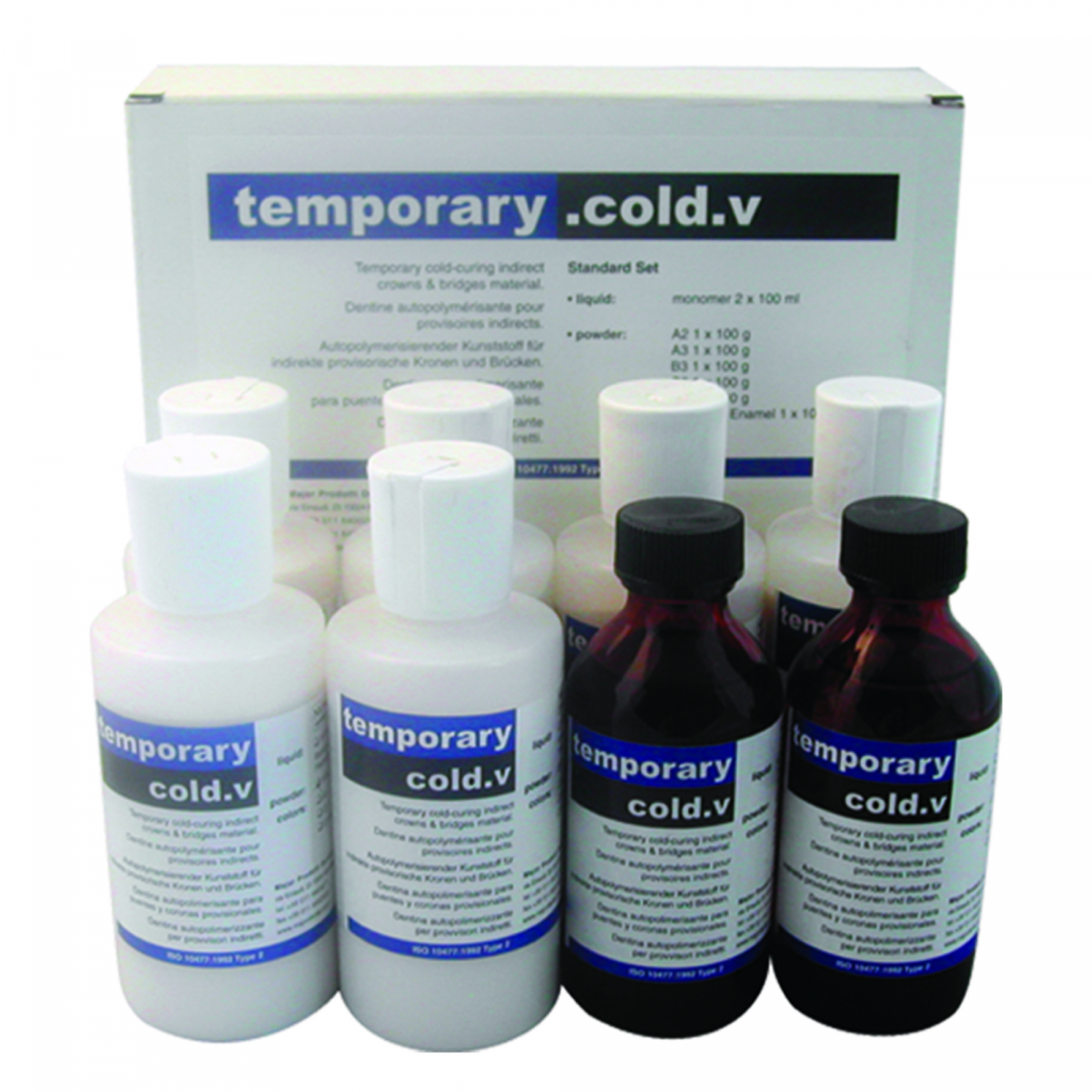 TEMPORARY COLD V Dentina autopolimerizzante per ponti e corone provvisorie. Standard Set composto da: 5 flaconi di polvere da 100 gr cad. (colori A2,A3,B3, C2,D3) + 1 flacone di Smalto Universale da 100 gr + 2 flaconi di liquido da 100 ml cad.
