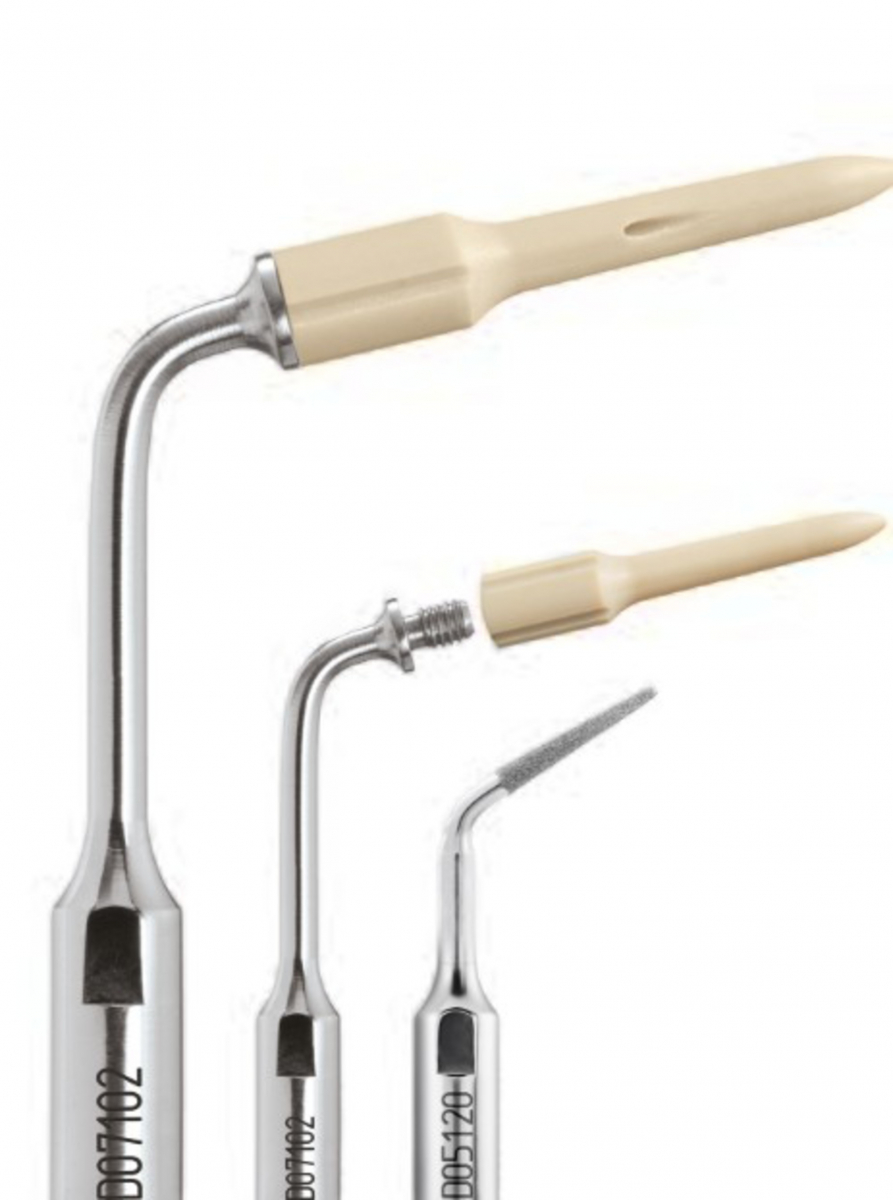 Tips D06007 -> 5 punte conica in PEEK (materiale plastico biocompatibile), lunghezza ~11,5 mm, Ø superiore ~0,92 mm e Ø alla base ~2,4 mm. Queste punte sono usate per la lucidatura delicata dello smalto e del bordo residuo dell’adesivo.