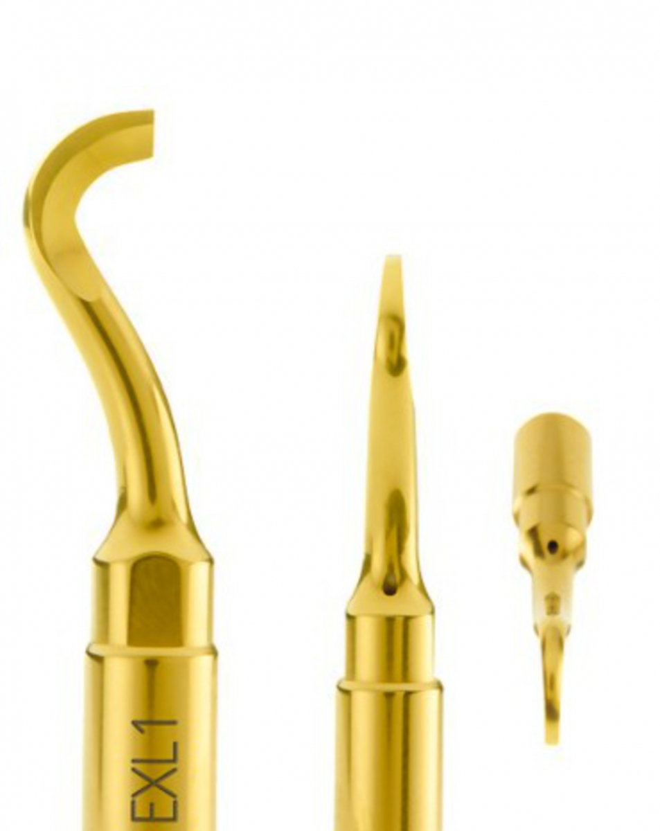 L'inserto EXL1 è progettato per facilitare l'estrazione del terzo molare, in particolare in situazioni complesse come radici angolate o radicolare difficile. La sua forma e il rivestimento in nitruro di titanio consentono una lussazione efficace e un'estrazione controllata, riducendo il rischio di fratture radicolari e migliorando la visibilità durante la procedura.