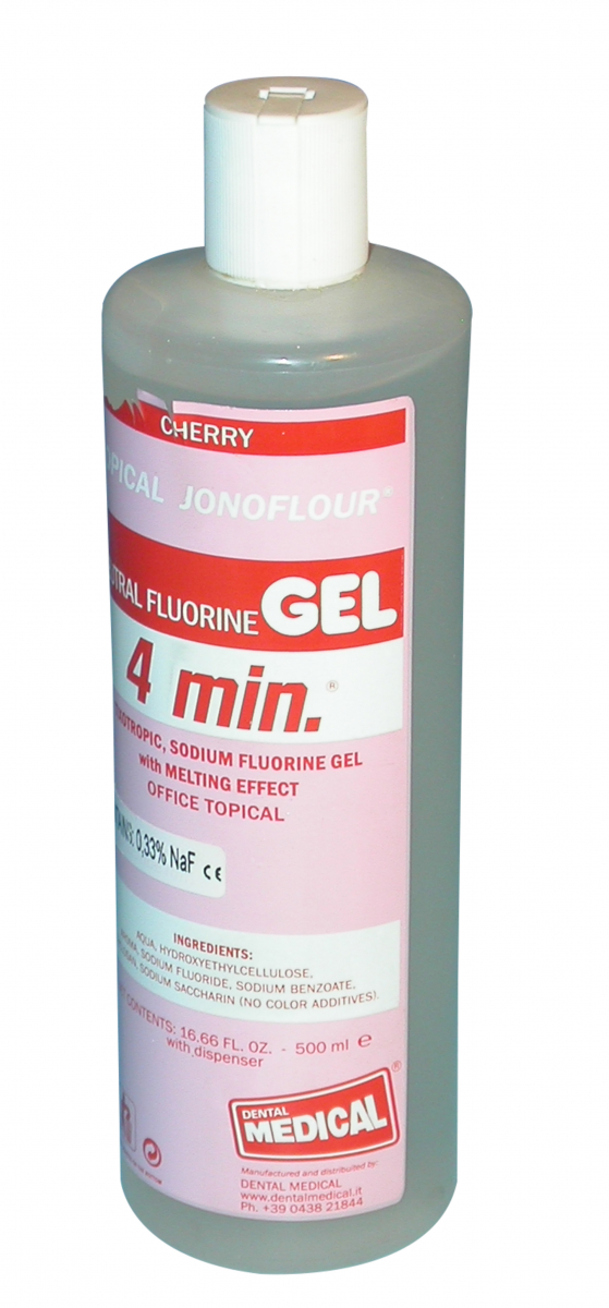 GEL DI FLUORO PER APPLICAZIONI TOPICHE (4 min.): gel di fluoro M.F.P. (Ammina Fluorurata-Monofluorofosfato di sodio 0,33% - pH neutro) Flacone da 500 ml