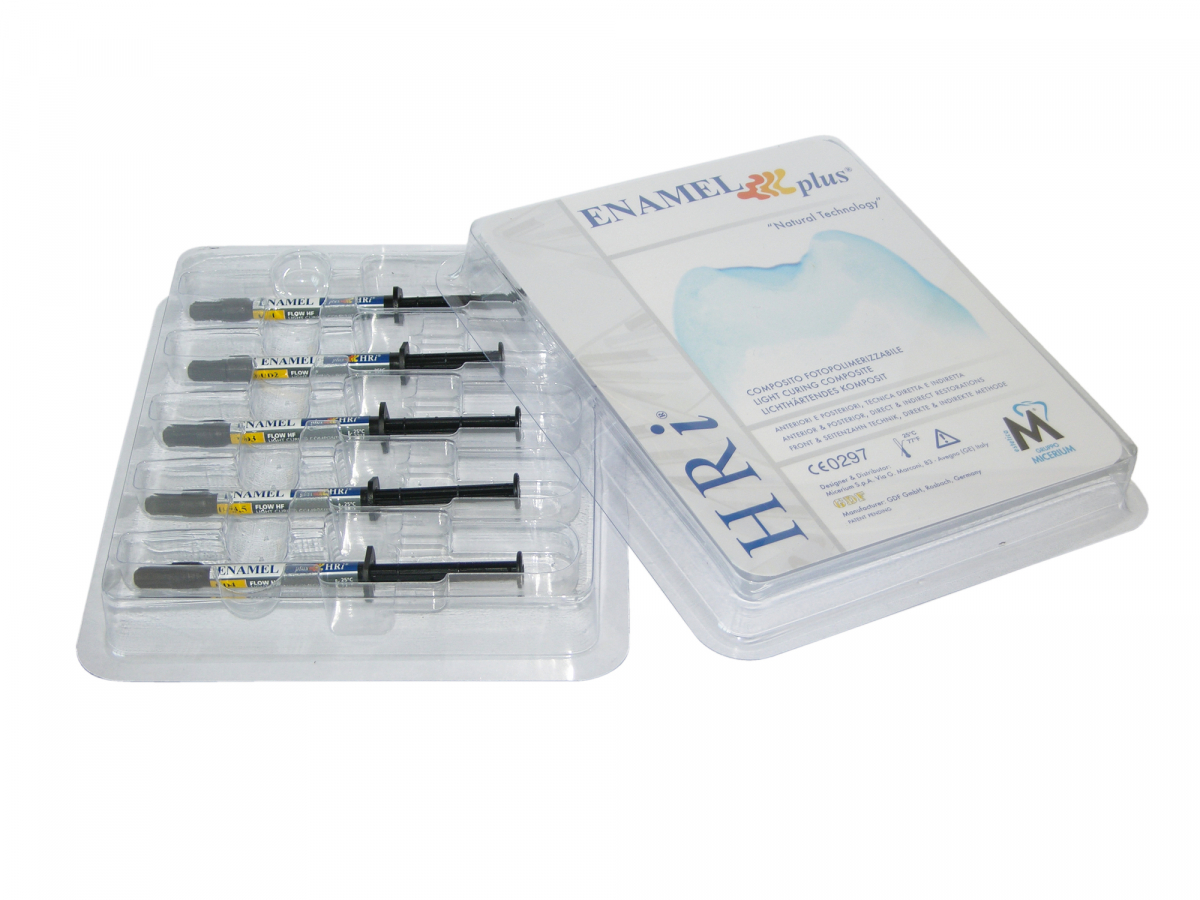 ENAMEL PLUS HRi "FLOW" - Micerium Composito fluido altamente riempito con migliorata viscosità (senza bolle) ed el asticità, maggiore radiopacità e miglior i proprietà fisiche, da utilizzare come sottofondo nei posteriori per restauri d iretti e indiretti e negli anteriori nel le V classi. Mini Kit: 5 siringhe da 2 gr di dentine (colori UD1/UD2/UD3/UD3,5/UD4)