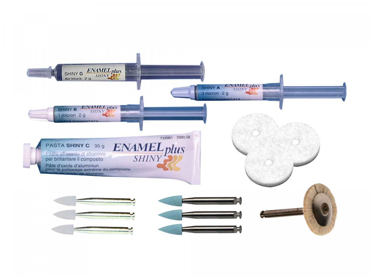 Sistema completo per la lucidatura e rifinitura del composito. Indicato per rifinire e lucidare ricostruzioni estetiche dirette in studio faccette e corone in laboratorio, realizzate in composito. TRIAL KIT STUDIO (COSSHINYY+G): 2 paste diamantate da 0,5 g cad. (Shiny A 3 µm, Shiny B 1 µm), 1 pasta all'ossido di alluminio da 4 g (Shiny C), 2 tips glicerina Air Block (Shiny G), 2 spazzolini di capra a ruota per CA (Shiny S), 1 feltrino a ruota (Shiny F), 1 feltrino a disco interprossimale (Shiny F), 1 gommino blu per CA e 1 mandrino per CA.