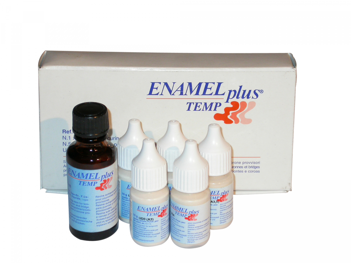 ENAMEL PLUS TEMP Resina acrilica per ponti, corone e provvisori estetici di II generazione. ENAMEL PLUS TEMP MINI KIT - Contenuto: 4 x 10gr. Enamel Plus Temp dentine (colori UD2/A2,UD3/A3,UD3.5/A3.5,UD4/A4) + 1 x 10gr.Enamel Plus Temp smalto (colore G2) + 1 x 25ml.liquido autopolimerizzabile