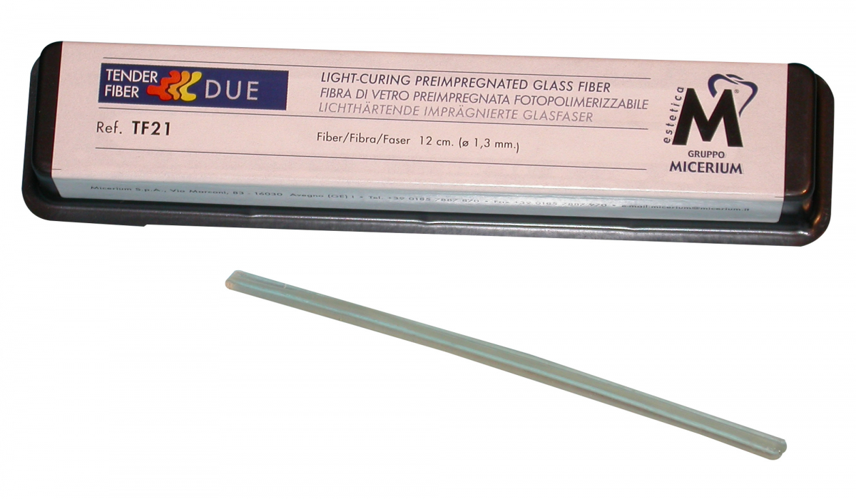 TENDER FIBER Fibre di vetro silanizzate preimpregnate singolarmente, per ottenere una forte connessione chimica tra la fibra e la resina composita del restauro; pronte all'uso. Non si sfilacciano e una volta polimerizzate possono essere tagliate facilmente. TENDER DUE Indicate per splintaggi parodontali. Confezione: 1 fibra da 12 cm (Ø 1,3 mm)