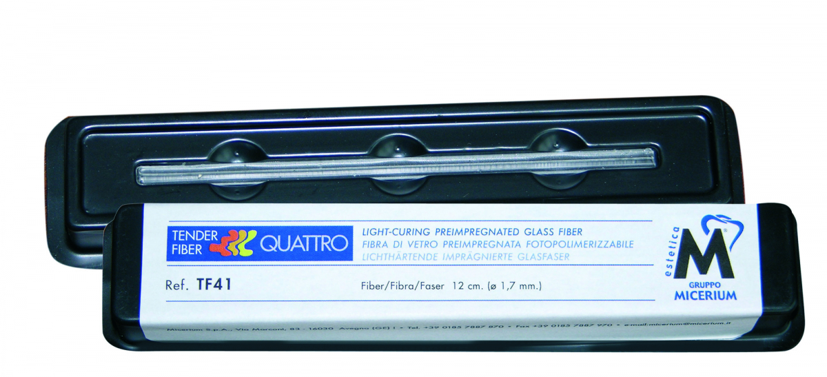 TENDER FIBER Fibre di vetro silanizzate preimpregnate singolarmente, per ottenere una forte connessione chimica tra la fibra e la resina composita del restauro; pronte all'uso. Non si sfilacciano e una volta polimerizzate possono essere tagliate facilmente. TENDER QUATTRO Indicate per Maryland in composito, ponti provvisori in resina, protesi in composito su impianti. Confezione: 1 fibra da 12 cm (Ø 1,7 mm)