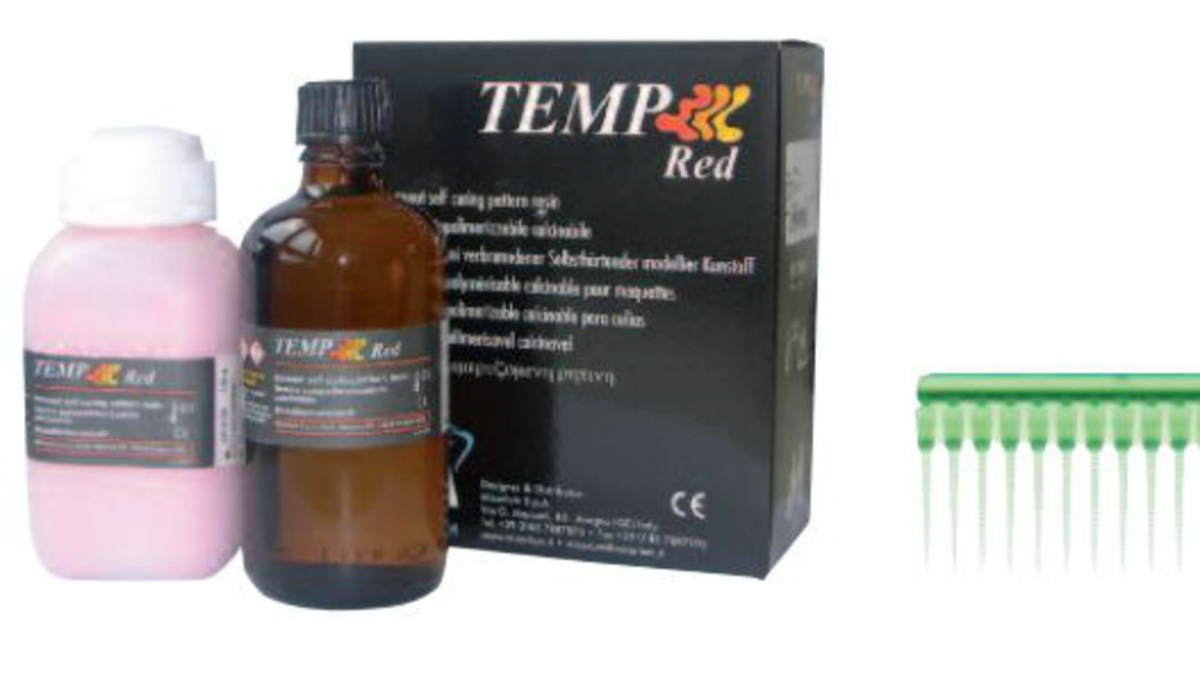 TEMP RED - Micerium Resina acrilica a bassissima contrazione (<1%), utilizzabile sia in studio, sia in laboratorio con tecnica a pennello o miscelazione. Indicata per lavori di pro tesi combinata, per la realizzazione di cappette, saldature, ponti, ancoraggi, a ttacchi e perni moncone. Brucia senza la sciare residui. Confezione: polvere da 100 gr + liquido da 100 ml