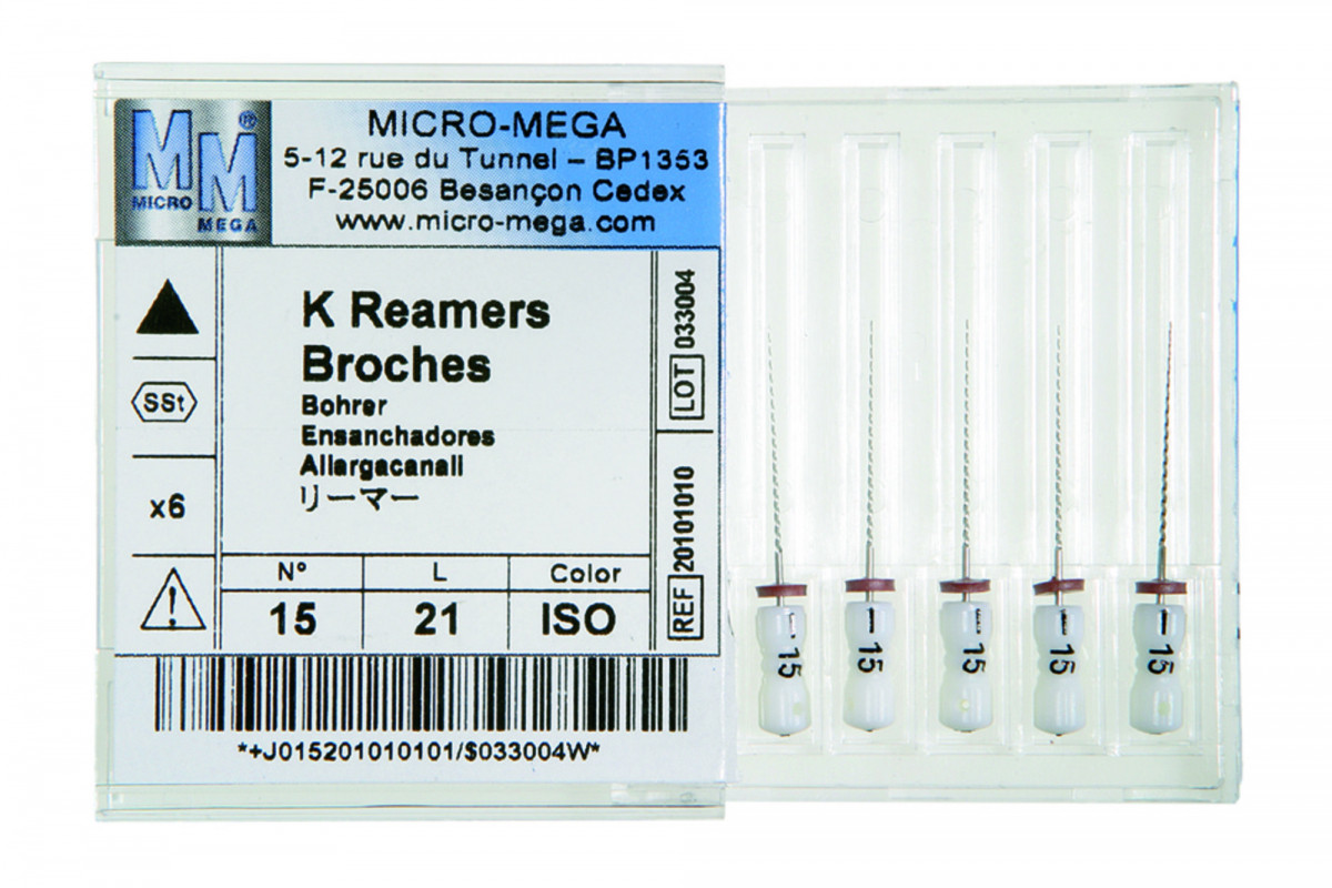 REAMERS Strumentario canalare, in acciaio inox. Manico in plastica, sterilizzabile a secco, fino a 180° C, e in autoclave. Placchetta da 6 strumenti
