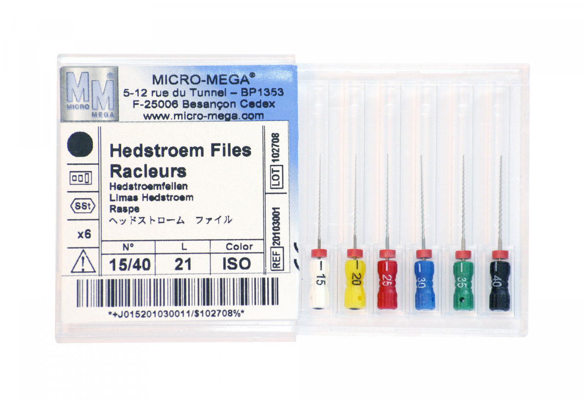 HEDSTROEM Strumentario canalare, in acciaio inox. Manico in plastica, sterilizzabile a secco, fino a 180° C, e in autoclave. Placchetta da 6 strumenti