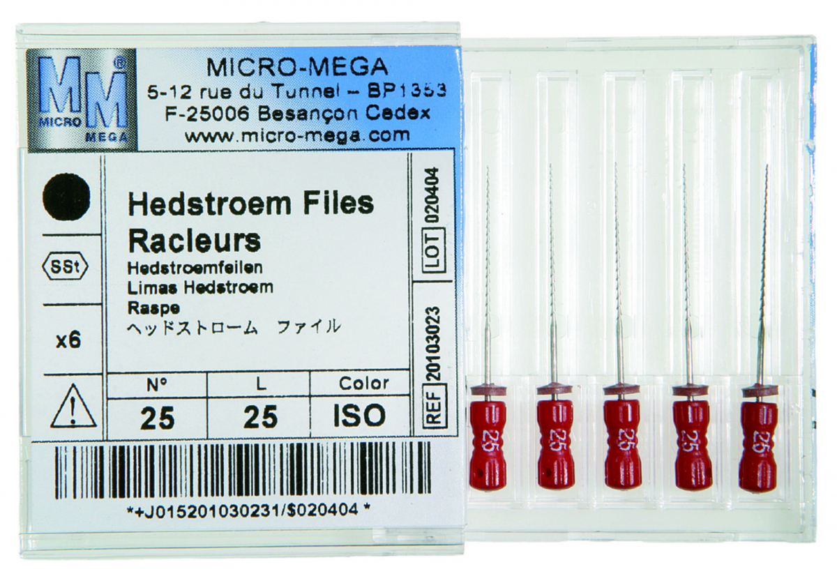 HEDSTROEM Strumentario canalare, in acciaio inox. Manico in plastica, sterilizzabile a secco, fino a 180° C, e in autoclave. Placchetta da 6 strumenti