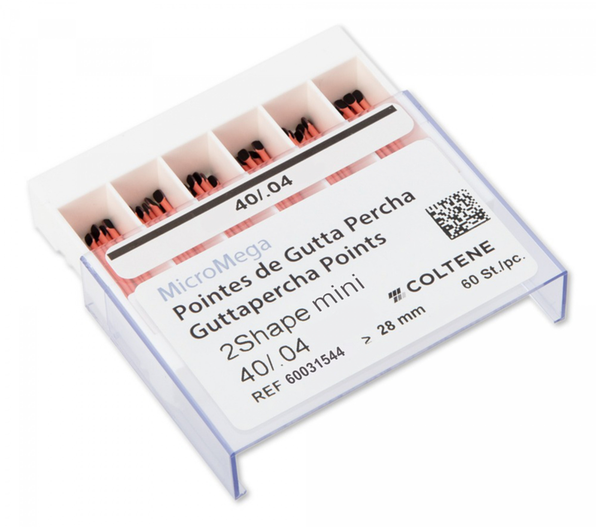 2Shape Mini Gutta‑Percha Points, ISO 25, conicità 4 % (0,04 taper), confezione da 60 pezzi.
