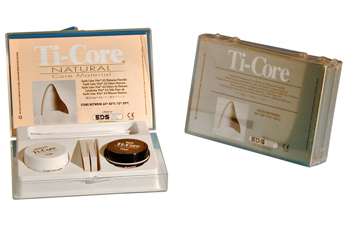 TI-CORE Composito autopolimerizzabile, con rilascio di fluoro, per la ricostruzione di monconi. Versione con Lantanidi (Colore Naturale). Confezione: base da 14 gr + catalizzatore da 15 gr + accessori