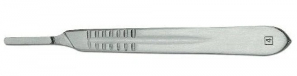 manico chirurgico progettato per l'utilizzo con lame di bisturi di tipo 4, specificamente per interventi in ambito odontoiatrico e chirurgico.