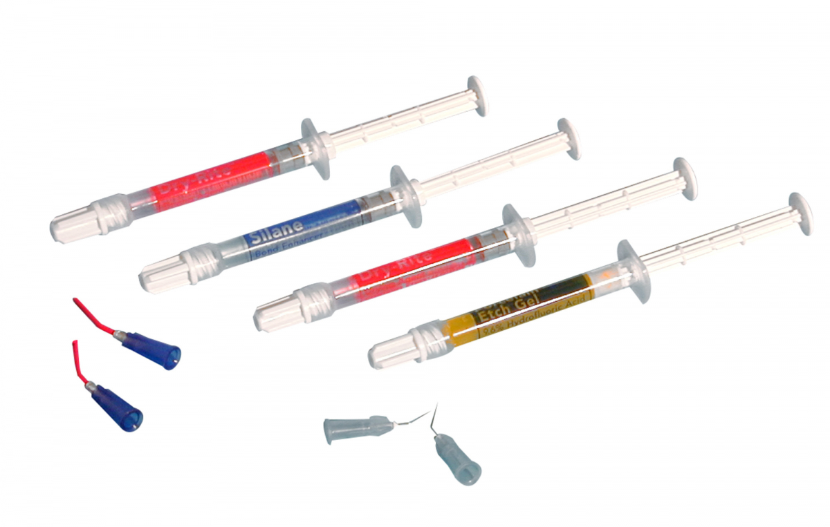 Kit di materiali specifici per preparare all'adesione prima della cementazione le superfici di manufatti ceramici realizzati per cottura, pressatura e tecniche CAD/CAM e per la riparazione intraorale di ponti e corone in ceramica fratturati. Il Kit contiene: 1 Porcelain Etch gel siringa da 1,2 mm., 1 Dry-Rite siringa da 1,2 ml., 1 Kool-Dam siringa da 1,2 ml., 1 Silane Bond Enhancer siringa da 1,2 ml., puntali assortiti.