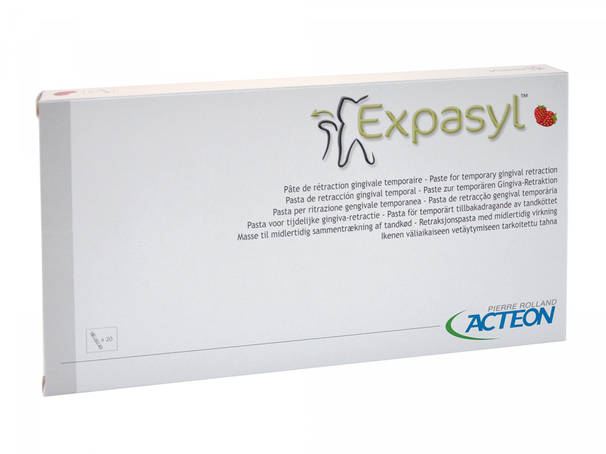 Sistema di retrazione gengivale a base di cloruro di alluminio al 15% e caolino in pasta facilmente asportabile che consente di effettuare un'apertura sulculare temporanea di qualità in soli 2 minuti e 30 secondi, senza rischio di ledere l'attacco epiteliale. Expasyl evita fenomeni di sanguinamento, la retrazione è temporanea e la gengiva ritrova la sua posizione originaria dopo pochi minuti senza traumatizzare i tessuti. Non necessita di anestesia. EXPASYL STRAWBERRY Al gusto di fragola, più piacevole e confortevole per il paziente. Ricambio pasta da 20 capsule