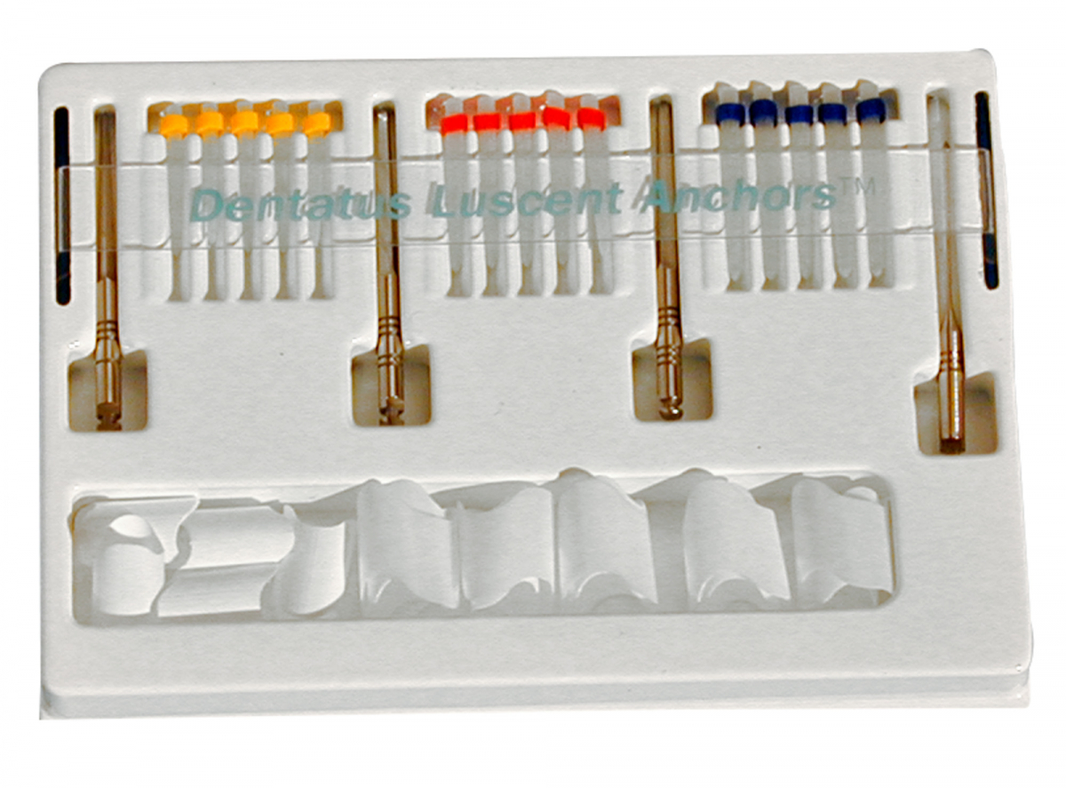 LUSCENT ANCHORS Perni radicolari in resina e fibra di vetro: trasmettono la luce e consentono la polimerizzazione di adesivo e composito direttamente nello spazio radicolare. Kit Intro: 15 perni (5 per misura) + 3 alesatori conici + 1 sonda + 15 matrici Form to fit
