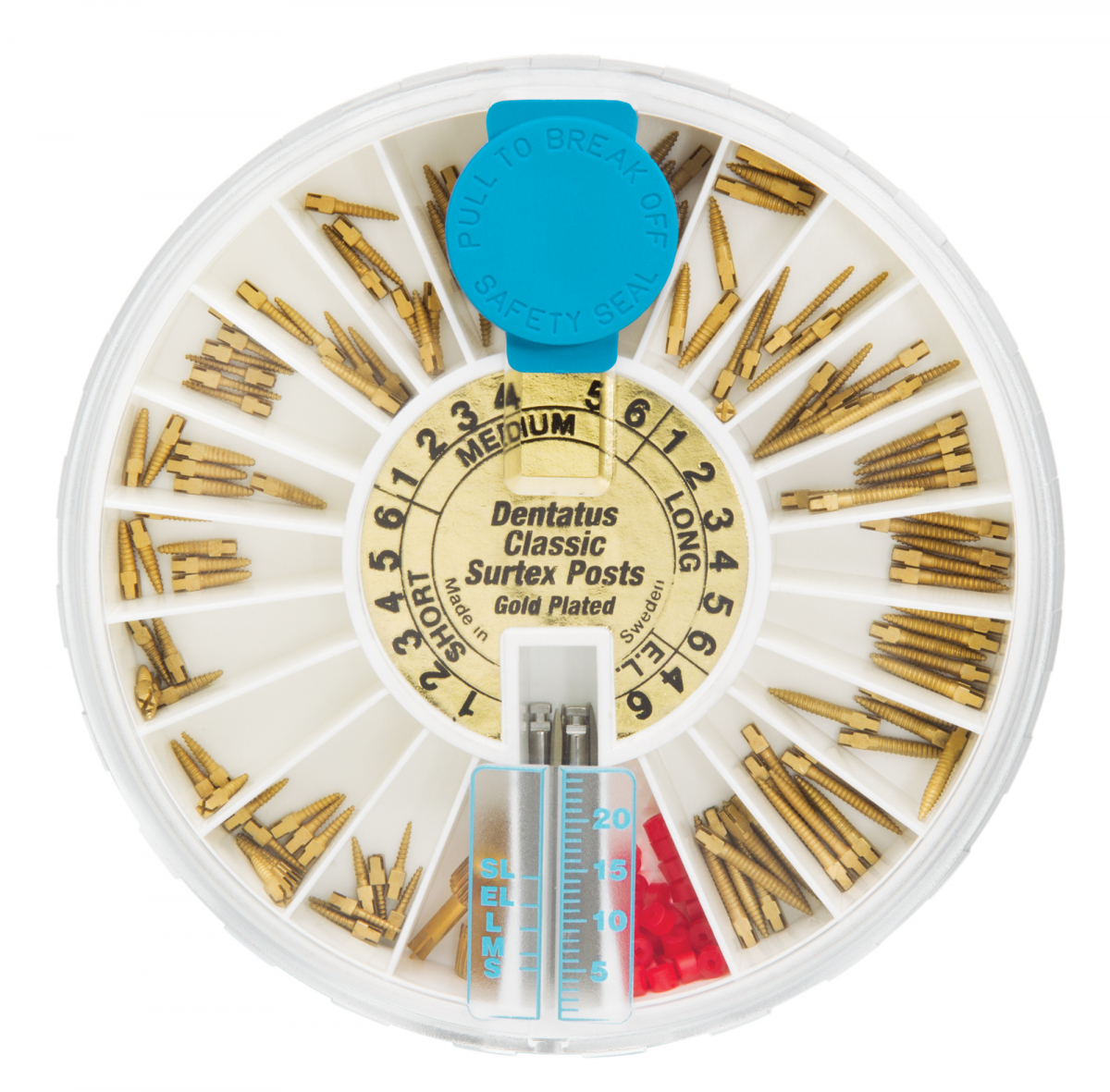 VITI SABBIATE SURTEX Perni endodontici dalla forma anatomica, sezione centrale cilindrica ed estremità inferiore conica. La superficie sabbiata irregolare garantisce una ritenzione doppia rispetto ai perni tradizionali. Ideale l'utilizzo con compositi e materiali traslucenti; non è necessario mordenzare o sabbiare. VITI DORATE Kit assortimento: 120 viti + 2 cacciaviti + 20 stoppers