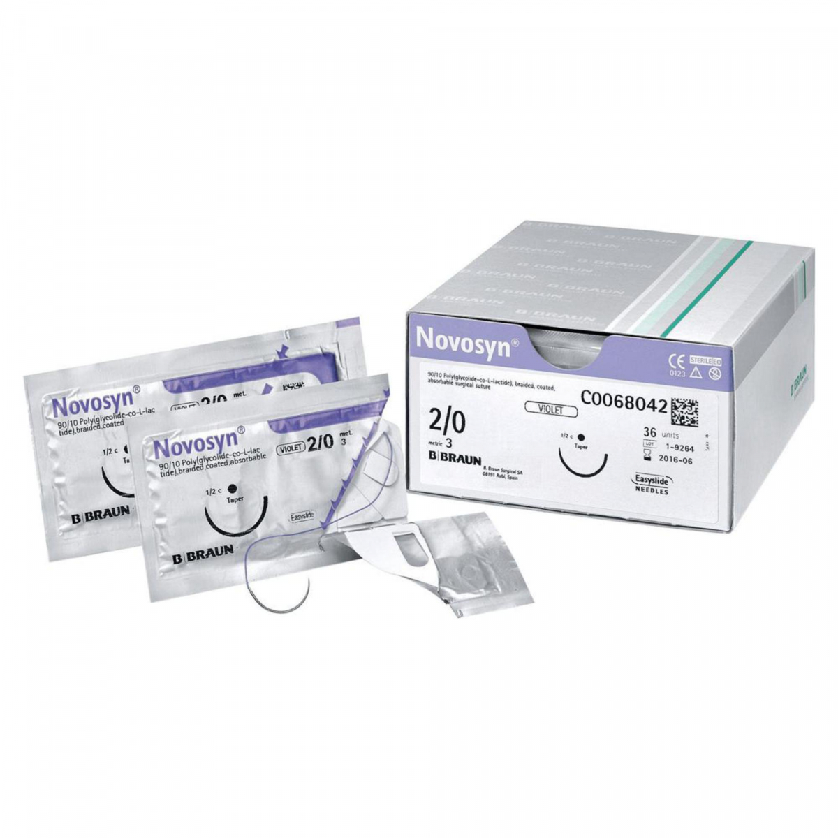 Sutura assorbibile intrecciata. Novosyn, composto da filamenti viola intrecciati di acido poliglicolico e acido lattico 90/10, assicura il profilo di assorbimento ideale per tessuti che necessiano di tempi di cicatrizzazione medi.