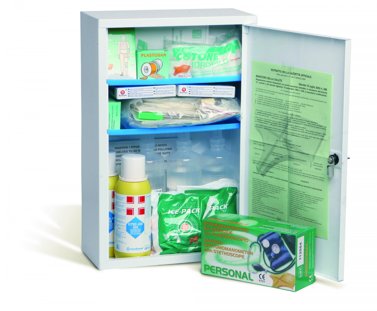 ARMADIETTO PER IL PRONTO SOCCORSO In metallo verniciato con polvere epossidica di colore bianco, dotato di serratura completa di chiave. Contenuto conforme a quanto previsto dal decreto ministeriale 388 del 15/07/2003. Contenuto Armadietto Grande: 5 paia di guanti sterili + 3 flaconi da 500 ml di soluzione fisiologica + 2 flaconi da 500ml di disinfettante iodopovidone al 10%iodio PMC + termometro + sfigmomanometro + mascherina con visiera paraschizzi + ghiaccio istantaneo + teli sterili + garze + cerotti + cotone + laccio emostatico ecc. Dimensioni: 30x46x14 cm (LxHxP). Peso: 7,5 Kg.