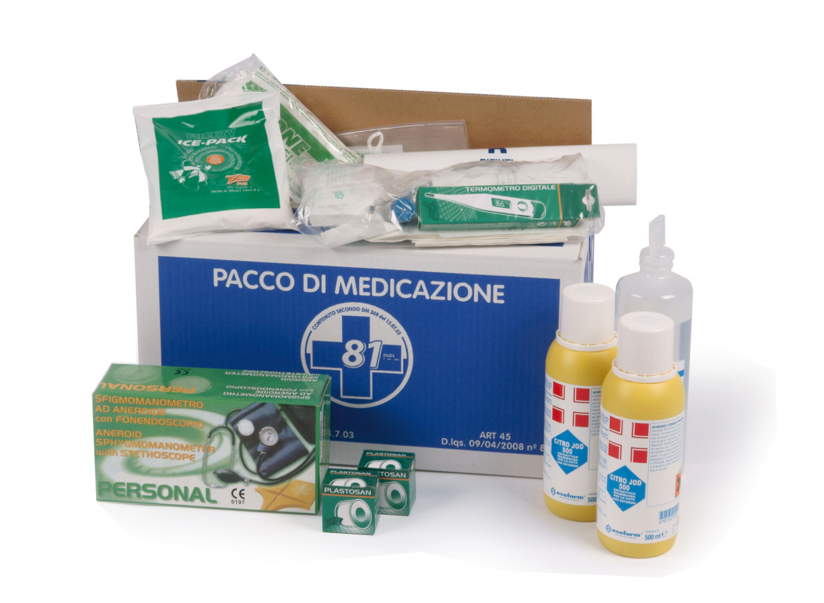 PACCO REINTEGRO PER ARMADIETTO PER IL PRONTO SOCCORSO (PER 3 O PIÙ PERSONE) Contenuto: 1 copia Decreto Ministeriale 388 del 15/07/2003 + 2 paia di guanti sterili + 1 disinfettante 125 ml iodopovidone al 10% iodio PMC + 1 soluzione fisiologica sterile 250 ml + 1 busta compressa garza sterile cm 18x40 + 3 buste compressa garza sterile cm 10x10 + 1 pinza sterile + 1 confezione di cotone idrofilo + 10 cerotti assortiti Plastosan + 1 rocchetto cerotto adesivo m 5x2,5 cm + 1 benda di garza m 3,5x10 cm + 1 paio di forbici cm 10 + 1 laccio emostatico + 1 pacco di ghiaccio istantaneo monouso + 1 sacchetto per rifiuti sanitari mm 250x350 + 1 istruzioni multilingua pronto soccorso
