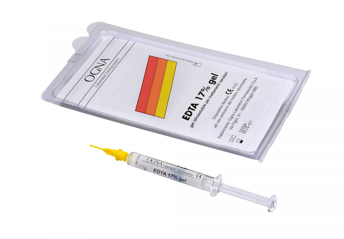 EDTA 17% GEL Gel idrosolubile a base di EDTA 17%, a pH lievemente alcalino, per la detersione dei canali radicolari dai residui organico minerali e per il condizionamento delle pareti canalari prima della cementazione dei perni. Confezione: 1 siringa di gel da 2,5 gr + 20 aghi applicatori monouso flessibili ed atraumatici