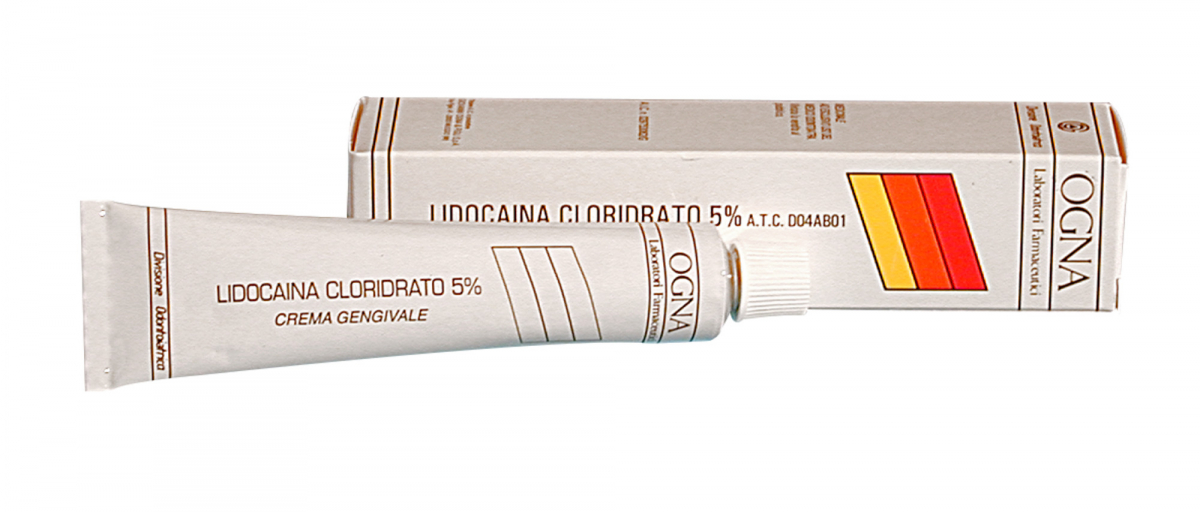 LIDOCAINA CLORIDRATO 5% (A.I.C. nr. 029753062/G)(A.T.C. D04AB01) Anestetico locale ad uso topico, ideale per desensibilizzare la mucosa orale. Contiene lidocaina cloridrato al 5%. La pasta deve essere applicata direttamente sulla gengiva asciutta con un breve e delicato massaggio. Confezione in tubo da 30 gr