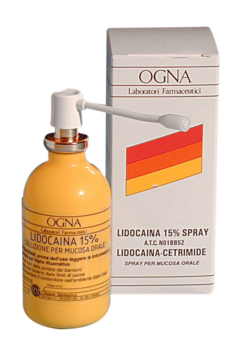 LIDOCAINA SPRAY 15% (A.I.C. nr. 034454013/G)(A.T.C. N01BB52) Anestetico locale ad uso topico, ideale come pre-anestetico per piccoli interventi chirurgici. A base di lidocaina cloridrato al 15%, svolge anche un'azione di disinfezione. Flacone spray da 50 gr con cannula erogatrice