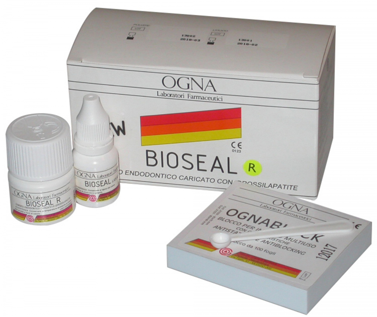 BIOSEAL Cemento canalare sigillante, radiopaco, a base di idrossido di calcio/ossido di zinco ed eugenolo. Caricato con idrossilapatite micronizzata, è caratterizzato da una notevole adesività ed è biocompatibile. BIOSEAL RETARD: lavorabilità 30-40 minuti ed indurimento completo a 300 minuti. Cofanetto: 1 flacone da 10 gr di polvere + 1 flacone da 6 gr di liquido + 1 blocco da impasto + cucchiaino dosatore