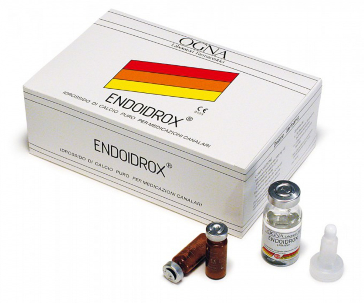 ENDOIDROX Idrossido di calcio puro, indicato per medicazioni canalari. Confezione clinica: 30 flaconi di polvere da 200 mg cad. + 2 flaconi di soluzione fisiologica da 10 ml cad.