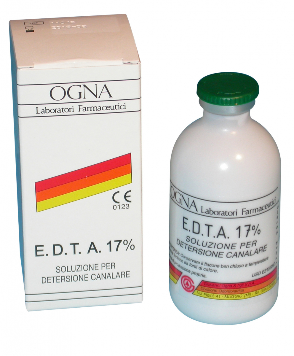 E.D.T.A. 17% Soluzione chelante, ad azione detergente, per il lavaggio canalare. A pH neutro, elimina i residui (fango dentinale) presenti sulle pareti dei canali. Flacone da 50 gr