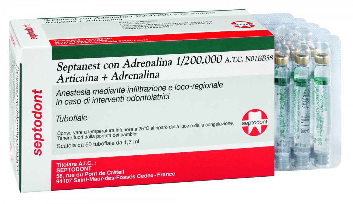 Anestetico locale, ad azione rapida e prolungata. A base di articaina al 4%, non contiene parabenzoati, è ben tollerato e viene eliminato rapidamente, in quanto metabolizzato a livell ematico. Septanest con Adrenalina 1:200.000 (A.I.C. nr. 028625022)(A.T.C. N01BB58).