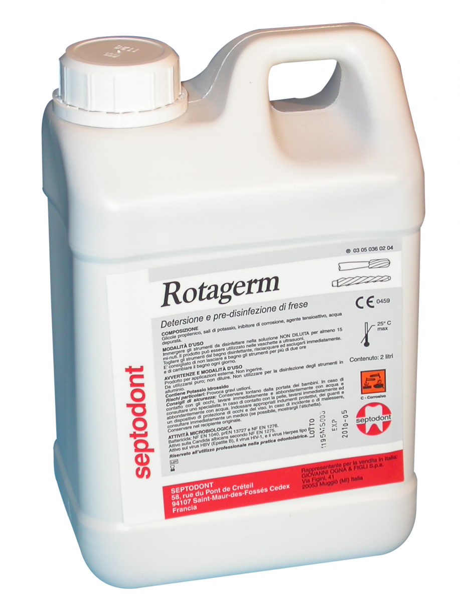 Soluzione pronta all'uso a base di Glicole Propilenico e Potassio Idrossido, per la disinfezione e detersione dello strumentario rotante, frese e punte montate. Svolge un'efficaceazione battericida, fungicida e virucida (inclusi HIV, HBV, Herpes, Poliovirus). Utilizzabile anche in ultrasuoni. Flacone da 2 Lt