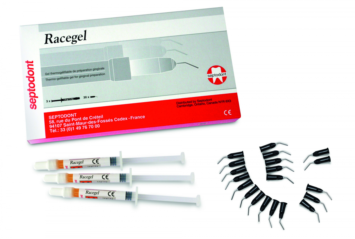 RACEGEL Gel a base di cloruro di alluminio al 25%, ad azione retrattrice, astringente ed emostatica. Confezione: 3 siringhe da 1,4 gr cad. + 30 applicatori