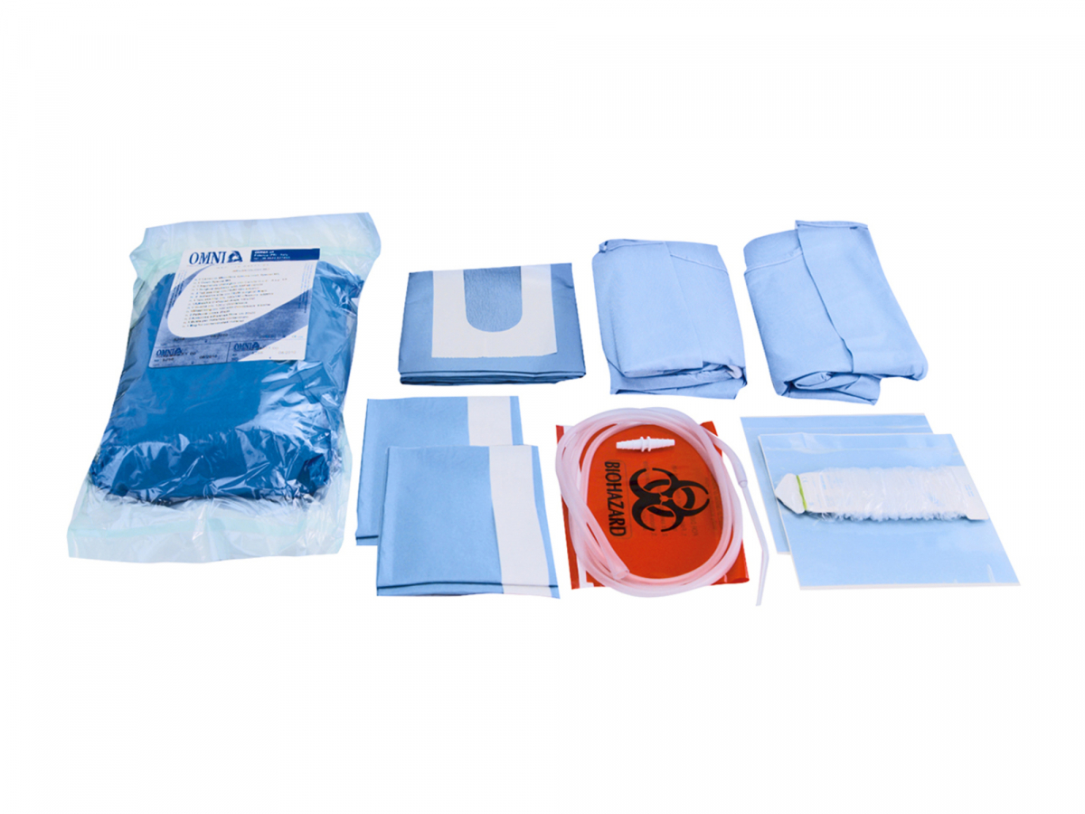 2 camici per operatore ed assistente (microfibra SMS) taglia M/L 2 teli con lato adesivo (TNT assorbente + polietilene impermeabile) cm 75x90 1 aspiratore chirurgico con cannula YANKAUER 1 telo sagomato ad ''U'' con adesivo per il fissaggio (TNT assorbente + polietilene impermeabile) cm 100x150 1 guaina Omnisleeve cm 120x7 2 pellicole adesive 2Cross20 cm 20x20 1 busta per materiale contaminato Il set è avvolto in un telo assorbente impermeabile 145x160 cm. 1 Set