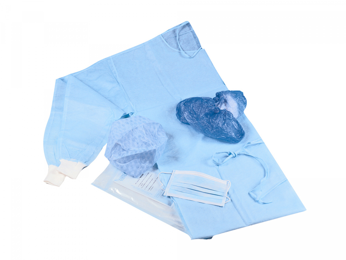 Kit composto da: 1 camice azzurro (TNT idrorepellente) con polsini in maglia, misura unica, lunghezza cm 110 + 2 copriscarpe in PVC azzurro antiscivolo + 1 cuffietta tonda in TNT azzurro con elastico + 1 mascherina in TNT azzurro con elastici auricolari.