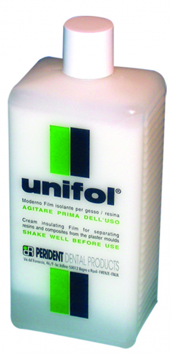 UNIFOL Isolante gesso/resina, a base di alginato ed olii emulsionanti, privo di formaldeide; penetra nel gesso creando un sottile film e consente una completa separazione della resina dal modello, senza alterare il risultato cromatico. Indicato per resine acriliche, composite e fotopolimerizzabili. Flacone da 450 ml