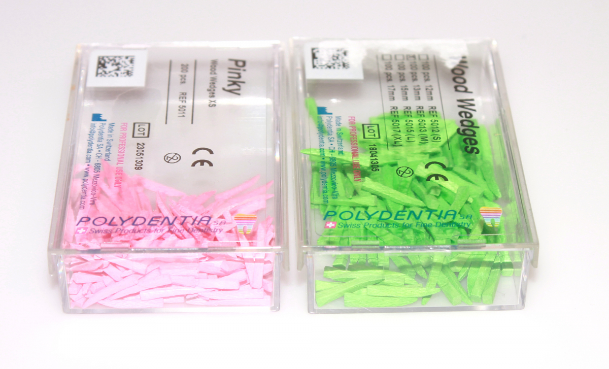 CUNEI INTERDENTALI IN LEGNO D'ACERO Cunei interdentali di forma anatomica con estremità quadrata per una presa facile e sicura, realizzati in legno antischeggia per garantire una buona stabilità e compressione. Confezione: 100 cunei