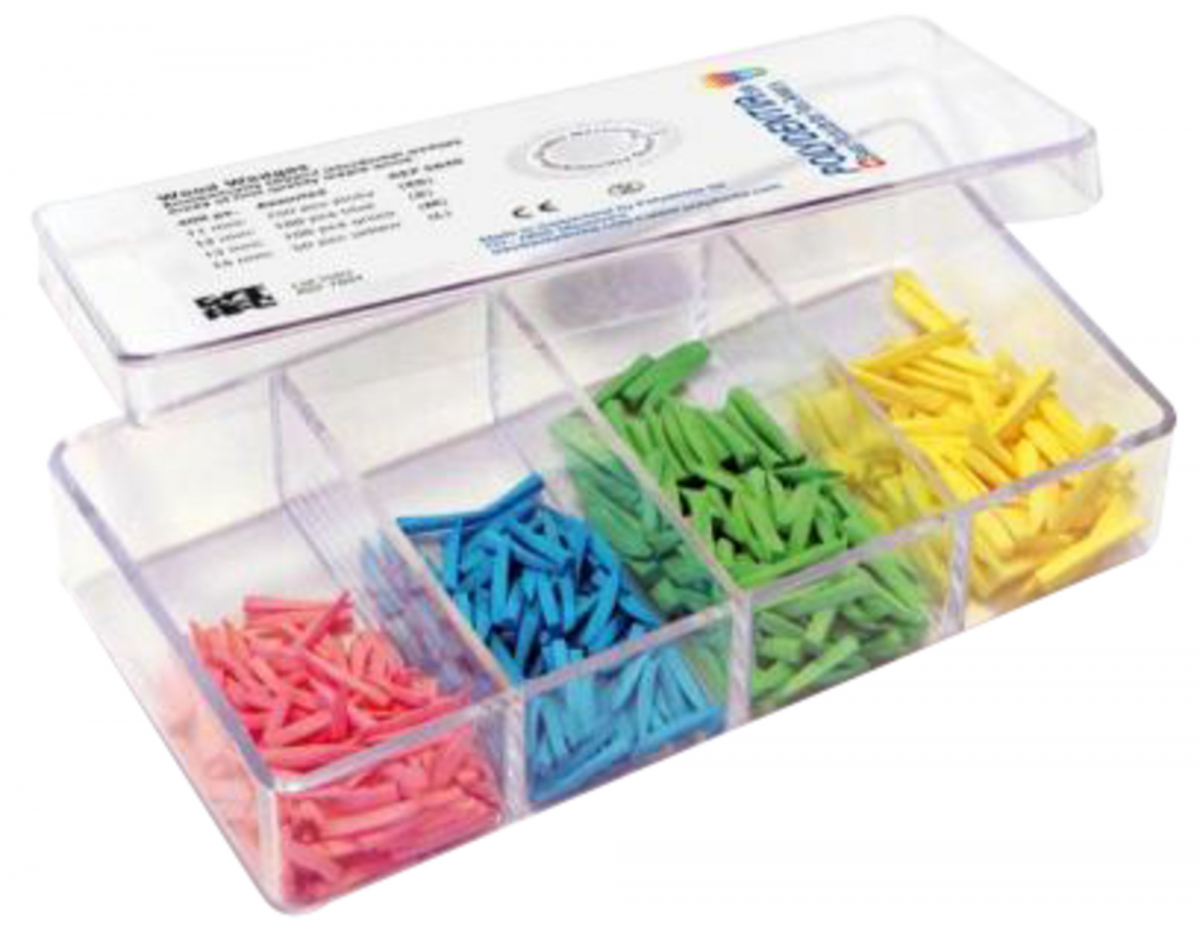 CUNEI INTERDENTALI IN LEGNO D'ACERO Cunei interdentali di forma anatomica con estremità quadrata per una presa facile e sicura, realizzati in legno antischeggia per garantire una buona stabilità e compressione. Assortimento da 600 cunei colorati