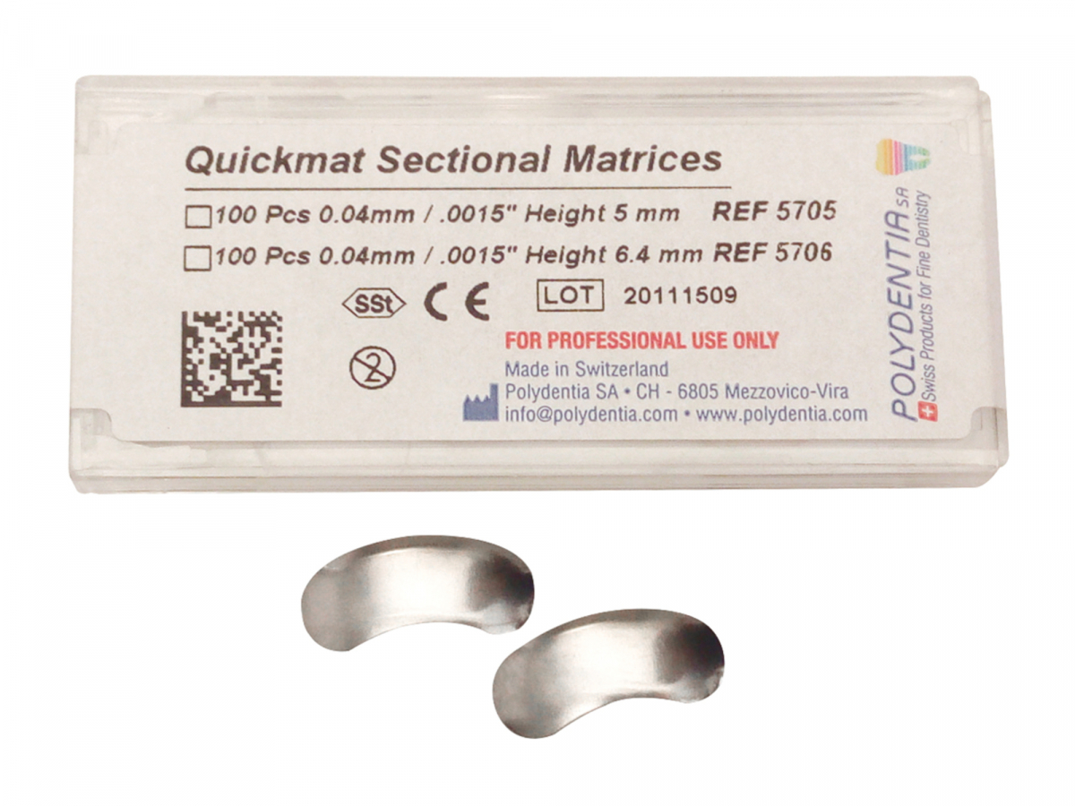MATRICI QUICKMAT - Polydentia Quickmat è il sistema di matrici seziona li che consente di realizzare con estrem a semplicità punti di contatto di precis ione nei settori posteriori utilizzando un solo tipo di anello universale compat ibile per tutte le applicazioni cliniche . É composto da matrici sezionali bombat e di forma anatomica tradizionale o con estensione speciale per preparazioni cer vicali estese. Disponibili in acciaio in ox o poliestere trasparente per una comp leta fotopolimerizzazione dei restauri e in due altezze (5 mm e 6,4 mm) e spess ori (0,04 mm e 0,025 mm). Gli anelli Qui ck, universali in acciaio inox autoclava bili a 134°C, sono sovrapponibili in cas o di cavità MOD, e si posizionano facilm ente con una comune pinza per diga. Alle loro estremità sono applicabili i t ubicini in silicone che ne impediscono l 'affondamento nello spazio interprossima le: i Delta Silicone Tubes, grazie alla loro innovativa forma triangolare, facil itano l'aderenza e l'adattamento delle m atrici in caso di ca