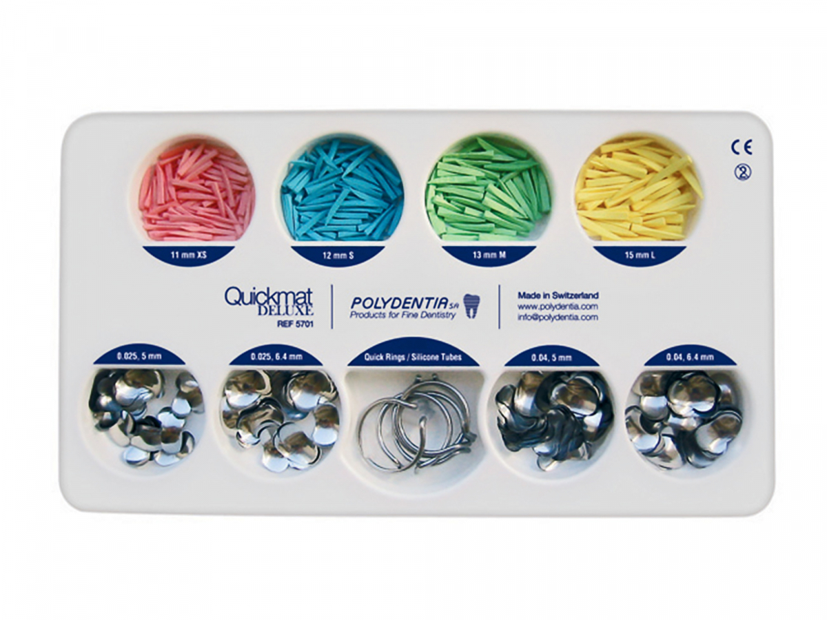 MATRICI QUICKMAT - Polydentia Quickmat è il sistema di matrici seziona li che consente di realizzare con estrem a semplicità punti di contatto di precis ione nei settori posteriori utilizzando un solo tipo di anello universale compat ibile per tutte le applicazioni cliniche . É composto da matrici sezionali bombat e di forma anatomica tradizionale o con estensione speciale per preparazioni cer vicali estese. Disponibili in acciaio in ox o poliestere trasparente per una comp leta fotopolimerizzazione dei restauri e in due altezze (5 mm e 6,4 mm) e spess ori (0,04 mm e 0,025 mm). Gli anelli Qui ck, universali in acciaio inox autoclava bili a 134°C, sono sovrapponibili in cas o di cavità MOD, e si posizionano facilm ente con una comune pinza per diga. Alle loro estremità sono applicabili i t ubicini in silicone che ne impediscono l 'affondamento nello spazio interprossima le: i Delta Silicone Tubes, grazie alla loro innovativa forma triangolare, facil itano l'aderenza e l'adattamento delle m atrici in caso di ca