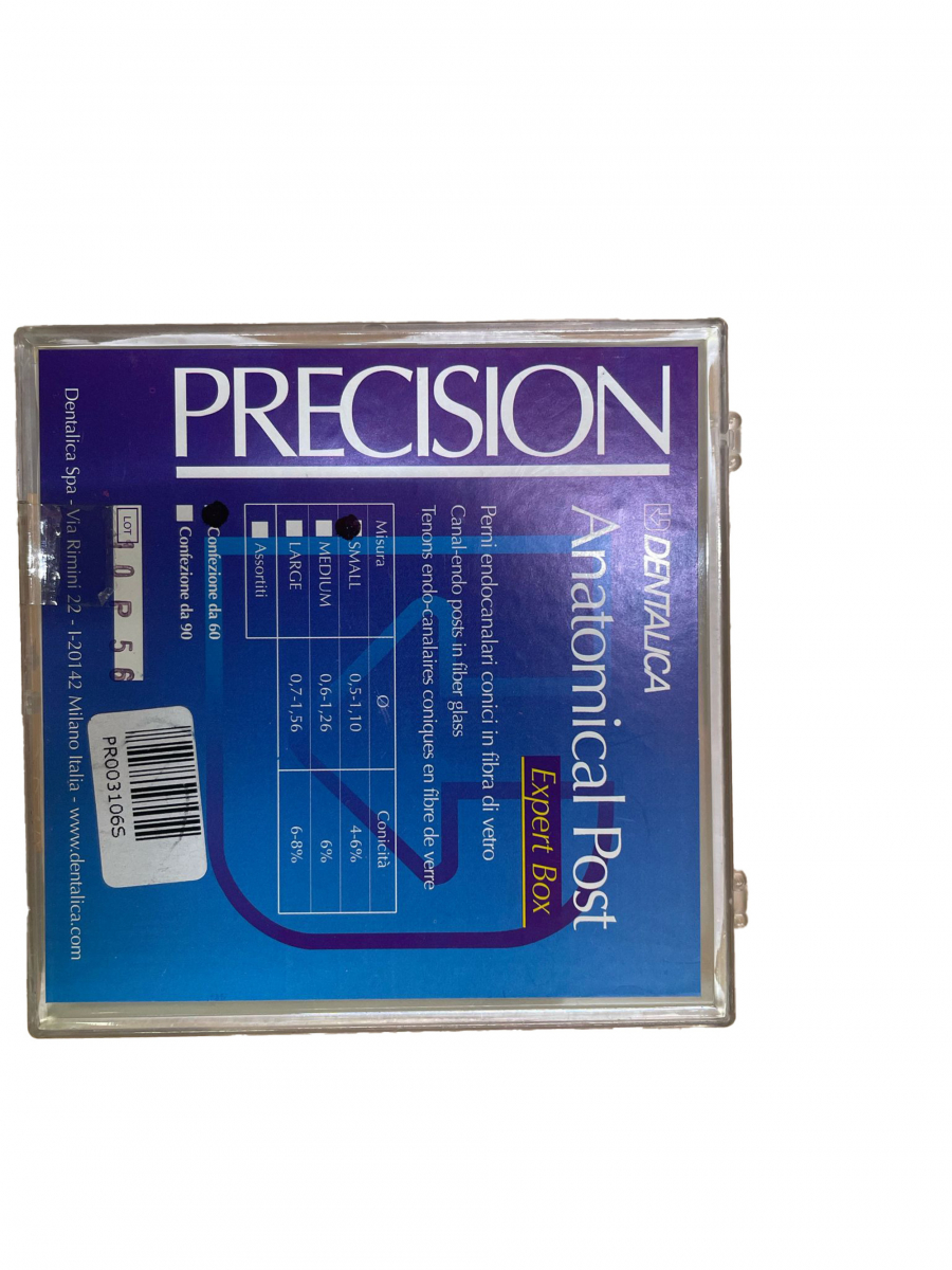 ANATOMICAL POST Primi perni endocanalari in fibra di vetro con forma multiconica simile a quella che si ottiene al termine di una normale preparazione canalare eseguita con gli strumenti NiTi a rotazione continua o con tecnica manuale. Presentano una conicità variata nell'ambito dello stesso perno. La superficie irruvidita e la giusta radiopacità, la forma anatomica altamente conservativa, ne garantiscono una salda e semplice applicazione anche in anatomie sottili. Expert Box: 60 pezzi