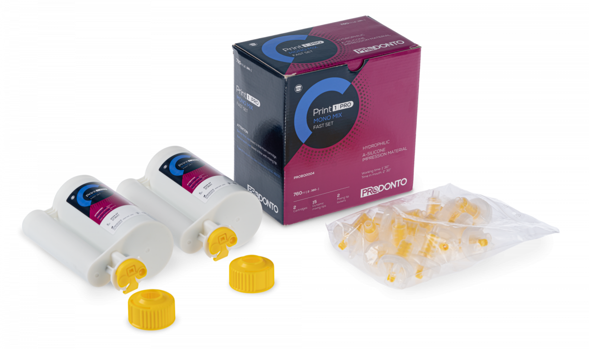 Print1PRO MONO MIX: Vinilpolisilossano idrocompatibile a media viscosità. Indicato nella tecnica monofase come materiale a viscosità unica come fluido sulle preparazioni e per il riempimento del portaimpronta individuale.