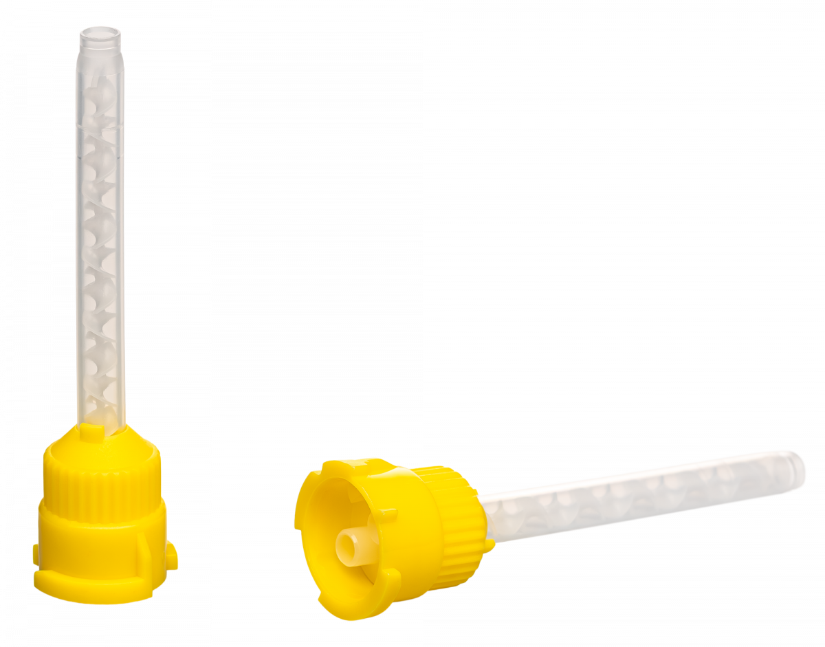 Il puntale giallo è un miscelatore statico progettato per l’erogazione di materiali bicomponenti in cartuccia. Grazie alle eliche interne bianche disposte a spirale, assicura una miscelazione omogenea e costante lungo tutto il flusso del materiale, eliminando la necessità di miscelazione manuale.