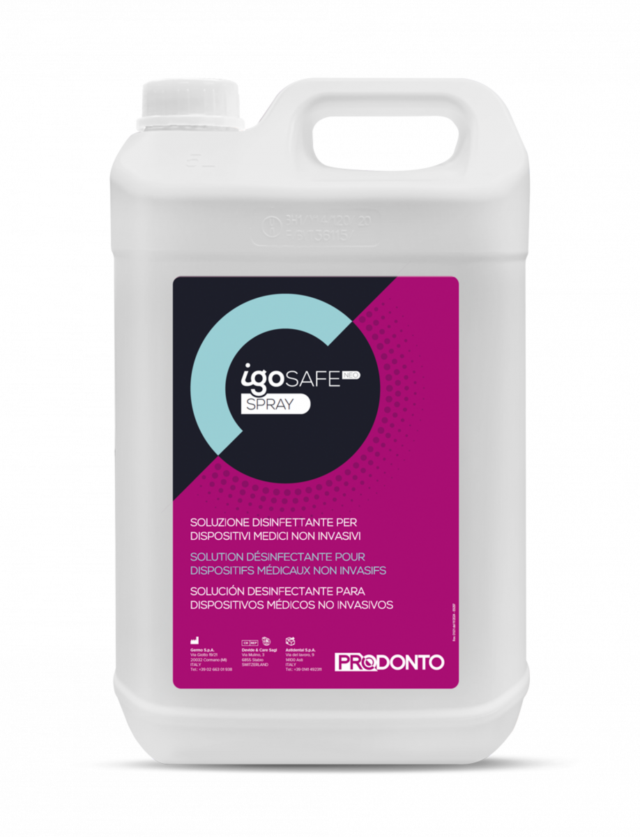 Soluzione idroalcolica pronta all'uso per superfici di dispositivi medici non invasivi, superfici grandi o difficilmente accessibili di apparecchiature biomedicali e riuniti nello studio odontoiatrico .